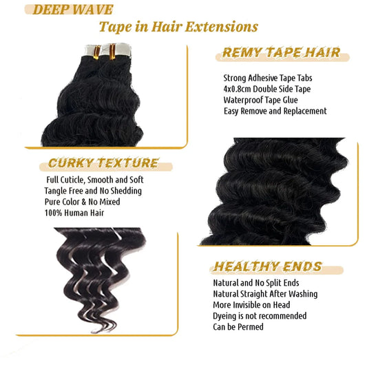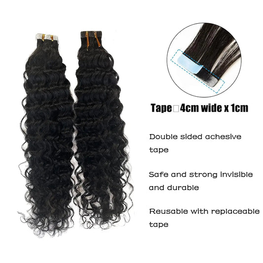 Deep Wave Tape in Hair Extensions Human Hair Natural Black Brazilian Curly Tape in Extensions Human Hair For Women 20Pcs/Set 50G